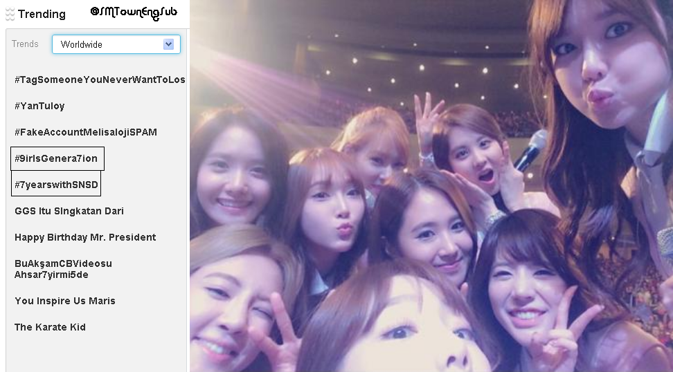 140805 Girls' Generation's 7th Anniversary hashtags "#9irlsGenera7ion" and "#7yearswithSNSD" are both trending Worldwide